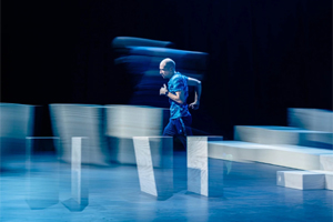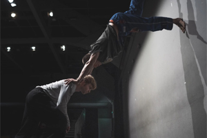 Im Doppelabend „Here Is There“ gibt Ioannis Mandafounis, Künstlerischer Direktor der Dresden Frankfurt Dance Company, erstmals einem Ensemblemitglied als Choreograf eine eigene Bühne. Thomas Bradley gehört seit 2023 zur DFDC. Für sein neues Werk verbindet er sein choreografisches System mit seinem unverwechselbaren Stil als Kostümbildner und arbeitet mit skulpturalen, den Körper verändernden Kostümen. Mandafounis widmet sich der Spannung zwischen dem Wunsch nach Transformation und der Trägheit der physischen Realität. Beide Choreografen manipulieren den Raum, um Bewegung entstehen zu lassen. Zugleich bewegen sie sich an der Grenze zwischen Geräusch und Musik: bei Bradley zwischen den Tönen, wenn ein Elektrogerät zerlegt wird, und einer Trompeten-Sonate, bei Mandafounis zwischen den Sounds von Objekten und der Live-Musik eines Schlagzeugers.