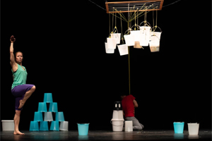 In großer Enge sehnt man sich nach Weite, im Tohuwabohu nach Reduktion und Klarheit. Oft enthält etwas sein eigenes Gegenteil. Die Bilder und Situationen in „This Beautiful Messy Thing“ sind von solchen Spannungen geprägt. Wo führt der Drang nach Veränderung hin? Vielleicht kann man die Kontraste selbst genießen, anstatt auf einen Moment zu hoffen, in dem alle Wünsche erfüllt sind. Beim Tanzen kann man mit den Grenzen der Situation spielen, anstatt von ihnen gebremst zu werden. Gegenstände, die als Baustoffe einer Szenerie dienen könnten, verweigern hier eine solche nützliche Ordnung und behaupten stattdessen als lärmende Objektchoreografie ihr Eigenleben. Da fliegt wohl einiges durch die Luft. In den Händen des Schlagzeugers Philipp Danzeisen vermischen sich Samples der verschiedenen Geräusche mit den Sounds der Trommeln. Die lebendige, organische Körperlichkeit der Tänzer*innen, eingegrenzt und gehalten durch das Bühnenbild, ganz nah am Publikum oder vereinzelt im Raum, wirkt so verletzlich wie kraftvoll. Es ist ein Stück von Mandafounis, nur noch lauter – und leiser.